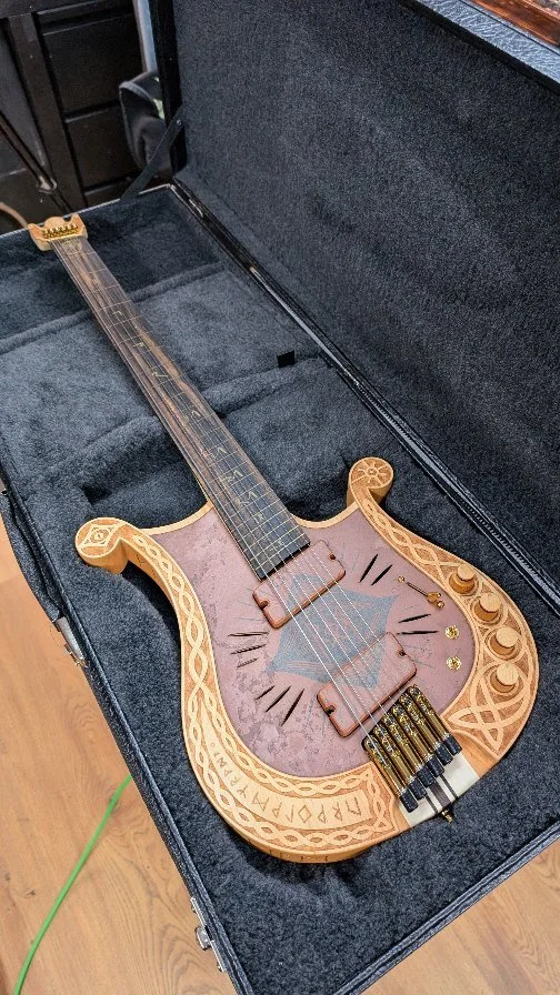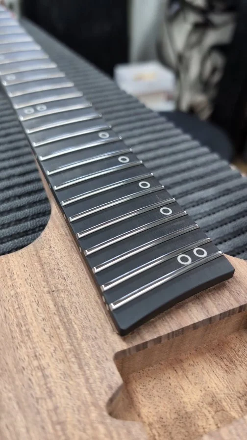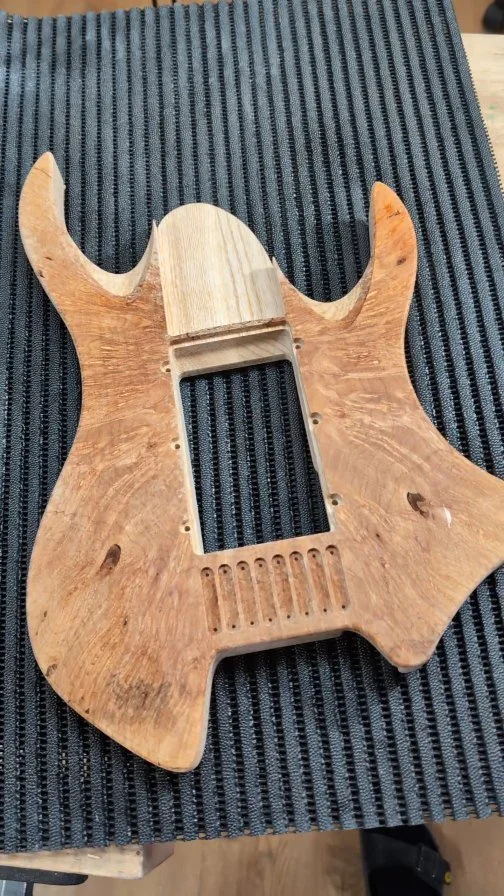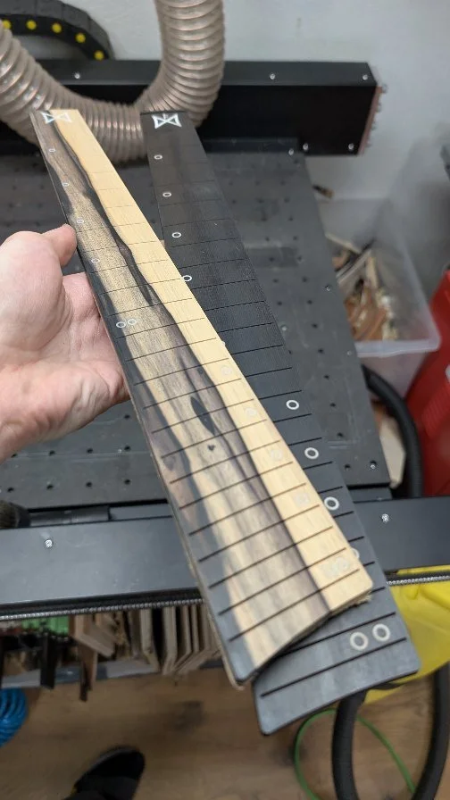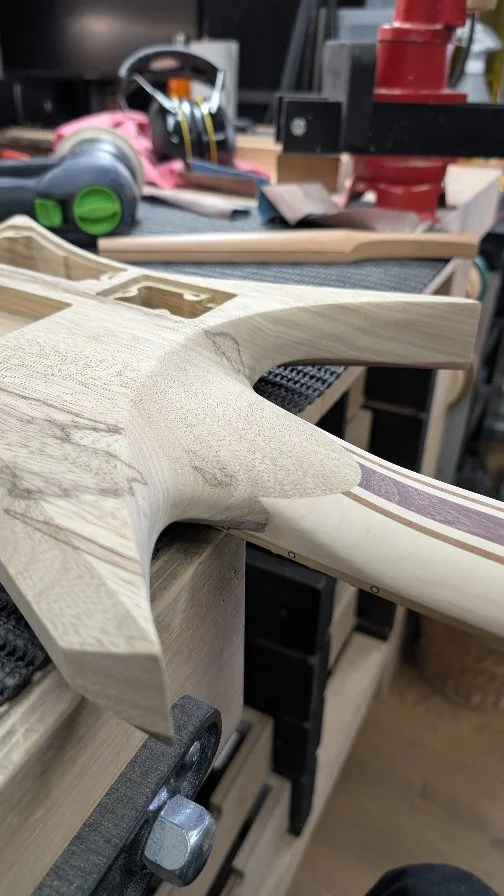 A robot is great at repeating a pre-programmed path exactly, but it can not read the wood and feel the instrument. That is why after the shape is roughly cut out I spend many hours fine-tuning the shape, making sure the neck as well as all the transitions and surfaces you as the player interact with feel right. This also means working with the wood and reading it to get the best finish possible.
