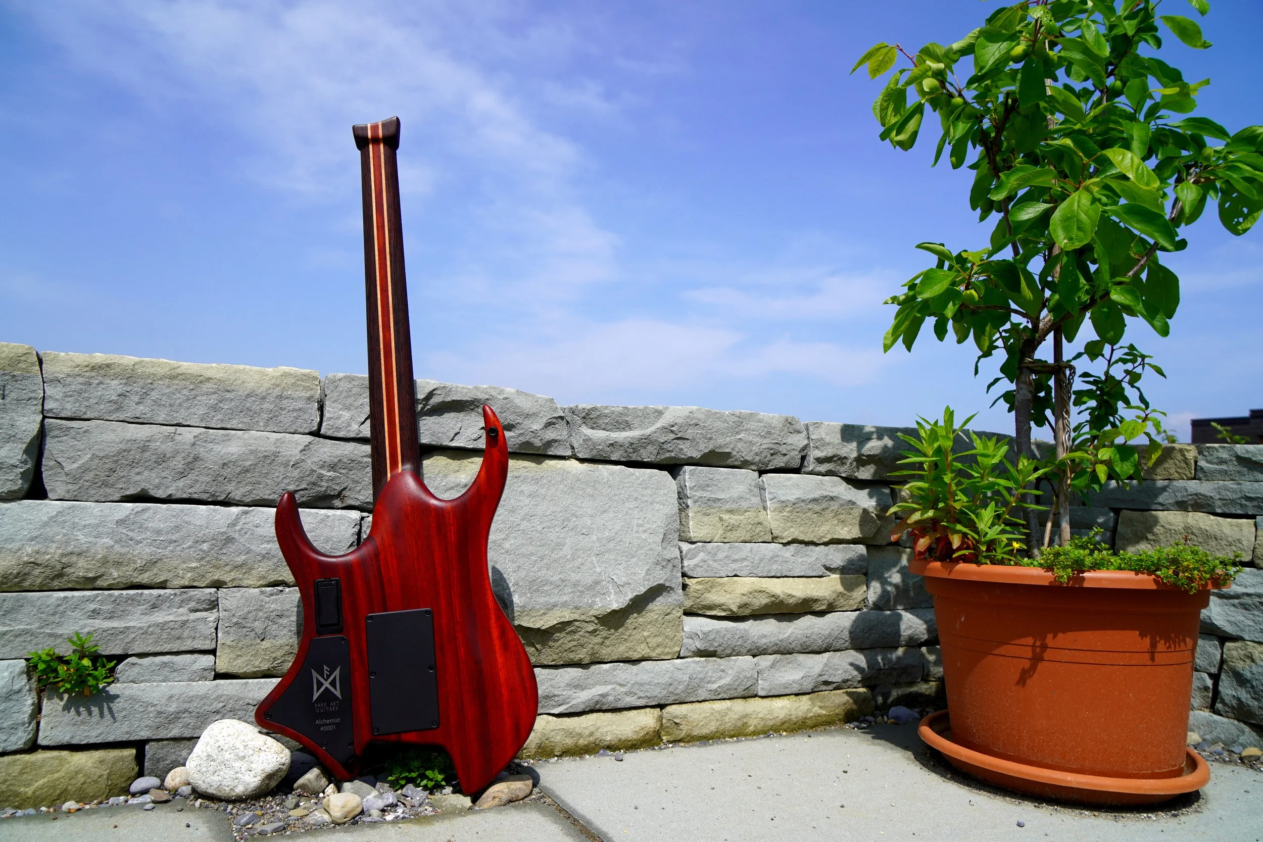 The Alchemist is my version of a modern headless guitar designed with metal in mind. Thanks to the pickups from Fishman and the tremolo bridge it is tremendously versatile, delivering crystal clear clean tones, authentic single coil sound, as well as soul crushing death metal. The padauk body shows off the natural beauty of wood in its beautiful shades of red that are almost iridescent in the light.