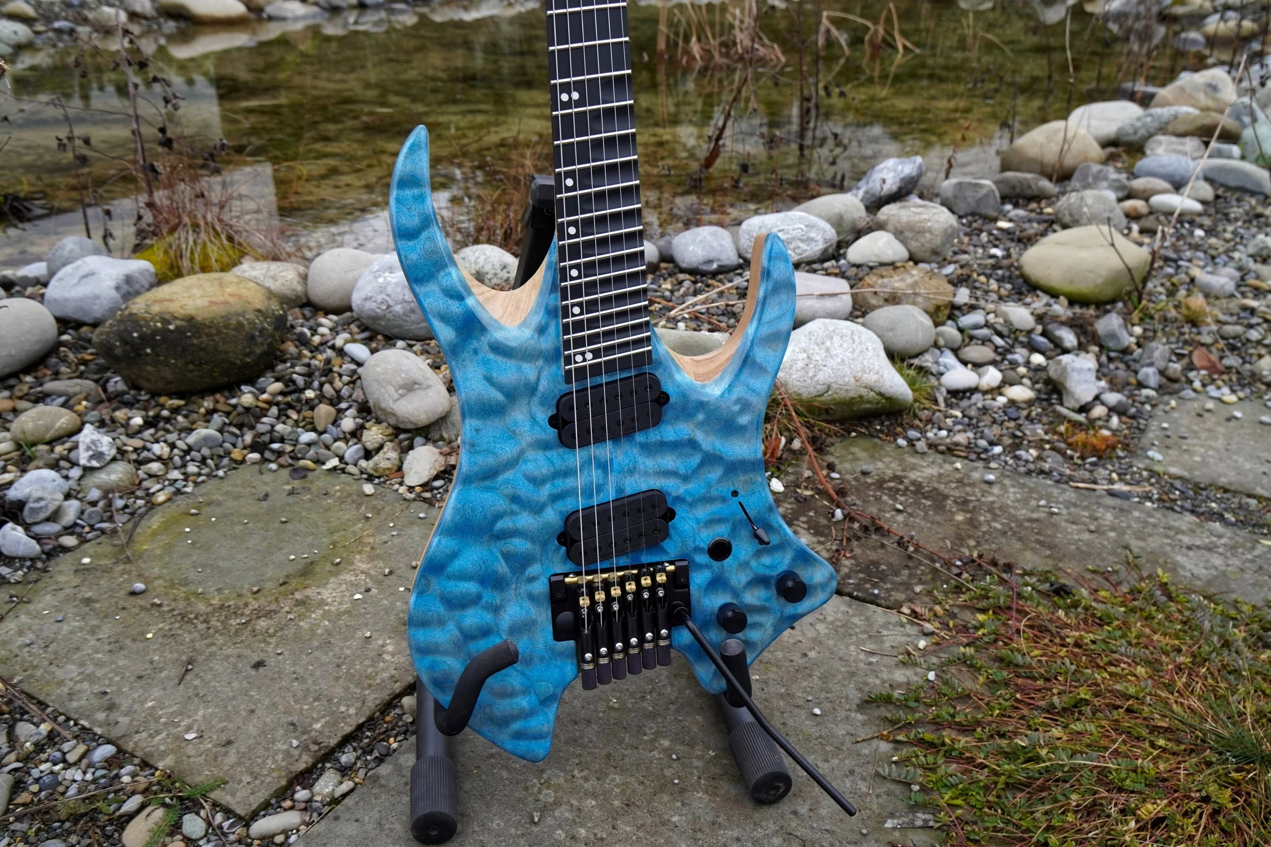 One of two almost identical builds I just finished. Designed for ultimate playing comfort this guitar comes in at just 2kg (4.4lbs) and is set up with super light 8-38 strings and only two springs on the tremolo. This allows for effortless expression of beautiful melodies with nothing in the way of creativity.